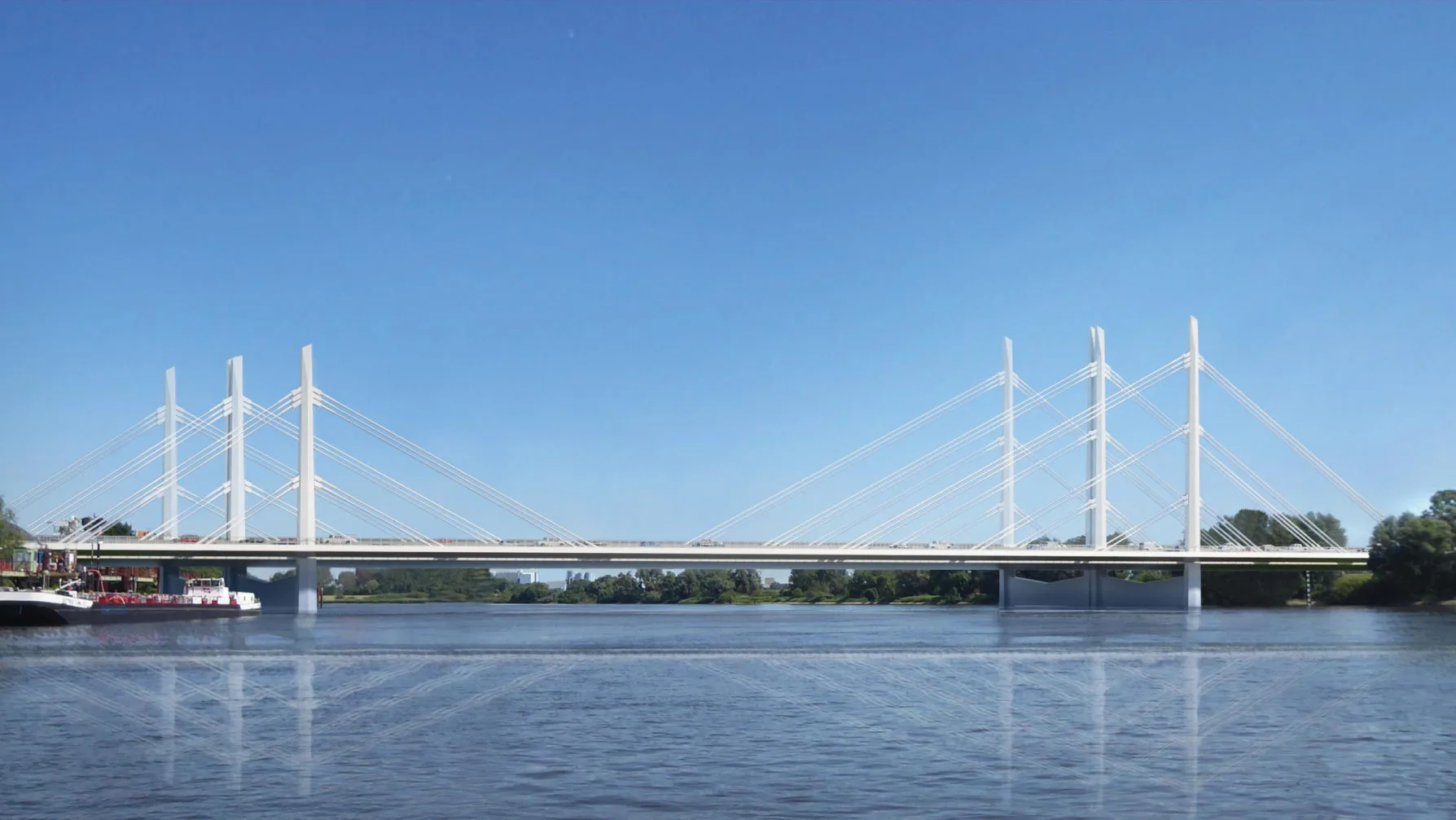 Der Überbau soll im Stromfeld sowie den beiden Seitenfeldern als geschlossener 3-zelliger Hohlkasten ausgeführt werden, im Stromfeld als reine Stahlkonstruktion und in den Seitenfeldern als Stahlverbund-Konstruktion. Zur Überführung eines Weges am östlichen Ufer wird ein zusätzliches Feld mit Spannbeton-Plattenbalkenquerschnitt ausgebildet.